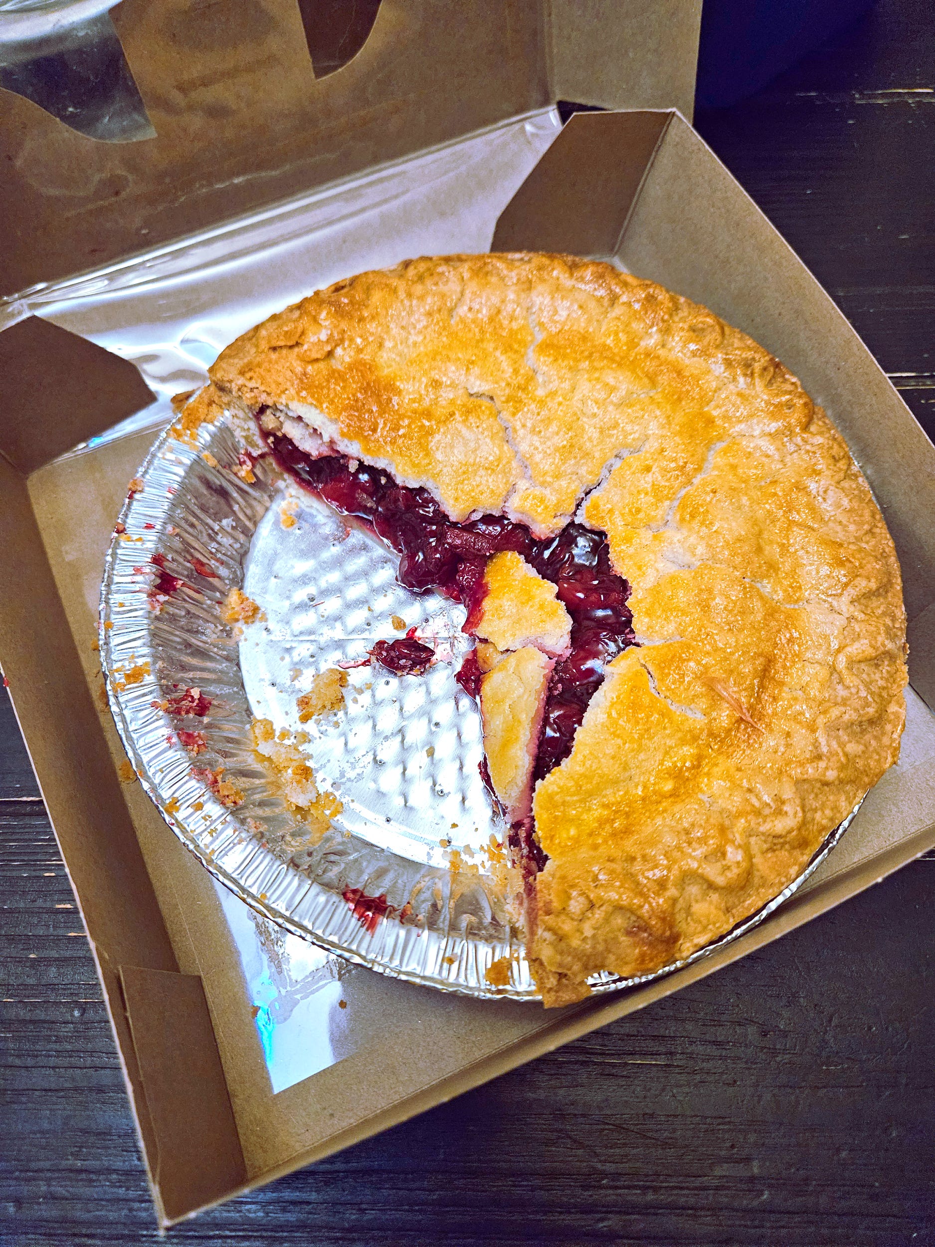 The pie was beautiful. Golden brown crust speckled with tiny sugar crystals. It must’ve been bathed in an egg wash before basking in the heat of the oven. Glints of purple-red cherry filling spilled from the steam circle in the center of the pie as if to beckon You know you want me.